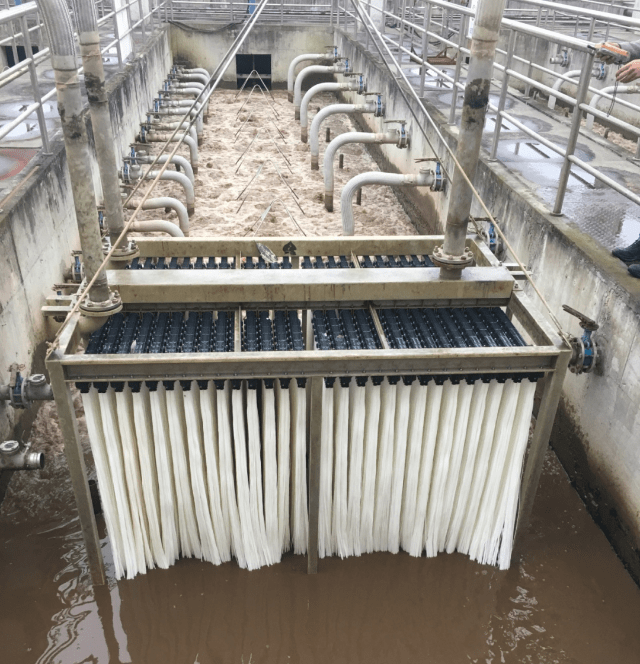 该项目设计处理水量为100 m³/d,采用4套浸没式超滤膜箱,膜材质为PVDF复合膜,共设置1个膜池。
