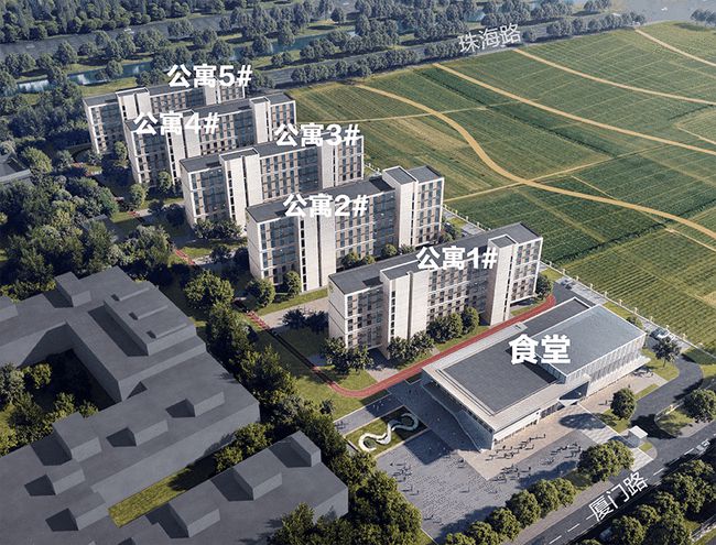 3号地块——人才公寓&食堂座落于江苏省南通市海门开发区内,为邮轮建造配套生活用房。总建筑面积为32524㎡,以南不远处就是招商局邮轮制造基地。该地块由五栋公寓楼和一个食堂构成。