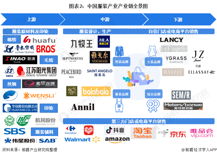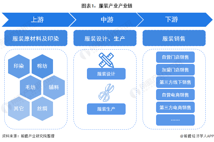 中国服装产业产业链主要分为上游服装原材料及印染;中游服装设计生产;下游服装销售。目前,中国服装企业大多进行了产业链的下游延伸,自产自销。随着电商经济的发展,以淘宝、京东为代表的第三方电商平台成为服装销售的重要渠道,大型服装企业也逐渐建设自己的线上电商平台,但在规模、流量方面依旧有着巨大的差距。