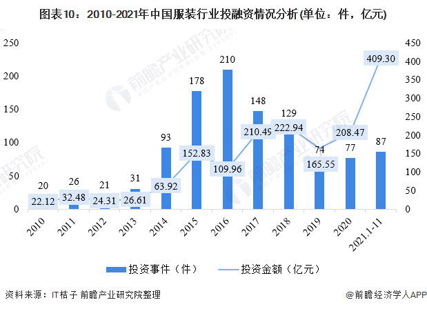 根据数据显示,2010-2021年11月,中国服装行业投融资事件数量呈先升后降趋势,投资金额呈现波动上升趋势。2021年1-11月,中国服装行业共发生投融资事件87件,相比2020年增加了10件;投融资总额达到了409.30亿元,相比2020年增加了96.34%。