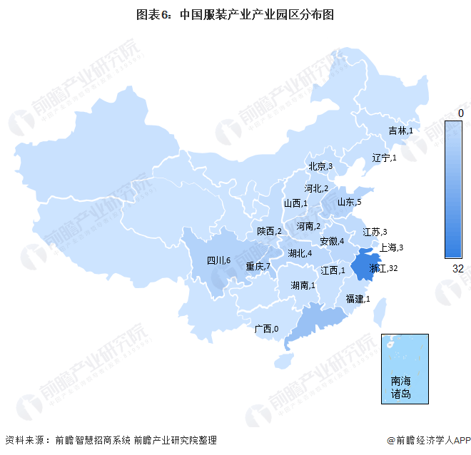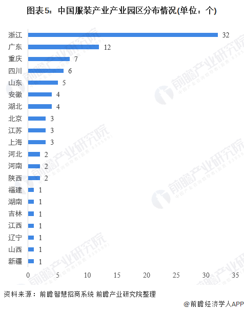 根据前瞻智慧招商系统显示,我国服装产业产业园区共有266个。进一步筛选出入驻企业数量大于等于10家的服装产业园,数据显示我国服装产业园主要分布在浙江、广东、重庆等地,其中浙江遥遥领先,拥有32个服装产业园;广东排名第二,拥有12个服装产业园;重庆排名第三,拥有7家服装产业园。