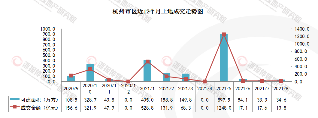 2021年8月,杭州市区成交2宗土地,出让面积16.2万方(243.3亩),成交建筑面积34.6万方,成交总价13.8亿元,无涉宅地成交。