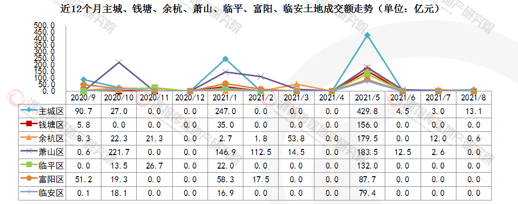 2021年8月,杭州主城区成交1宗土地,出让面积14.2万方,成交建筑面积32.6万方,成交总价13.1亿元。余杭区成交1宗土地,出让面积2.1万方,成交建筑面积2.1万方,成交总价0.6亿元。