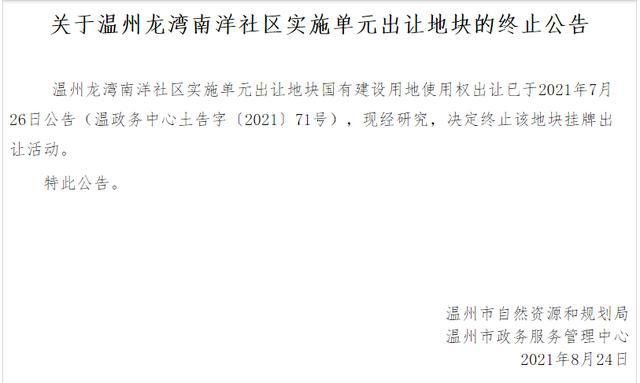 与此同时,原定同日出让的一宗温州鹿城区商住地和一宗乐清商住地却都在出让前终止。