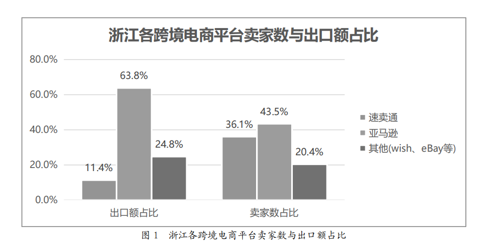 2020年,浙江省面向各地产业带全面部署开展“店开全球”跨境电商万店培育专项行动计划,全力破解“开店难”的问题。当前,浙江省在主要监测的第三方电子商务平台上的跨境出口比较活跃网店数量突破了11.7万家[2]。据研究院测算,浙江跨境 B2C电子商务卖家选择使用最多的全球跨境平台是亚马逊,占比约43.5%,浙江卖家在亚马逊平台的出口额占监测平台出口总额的63.8%。