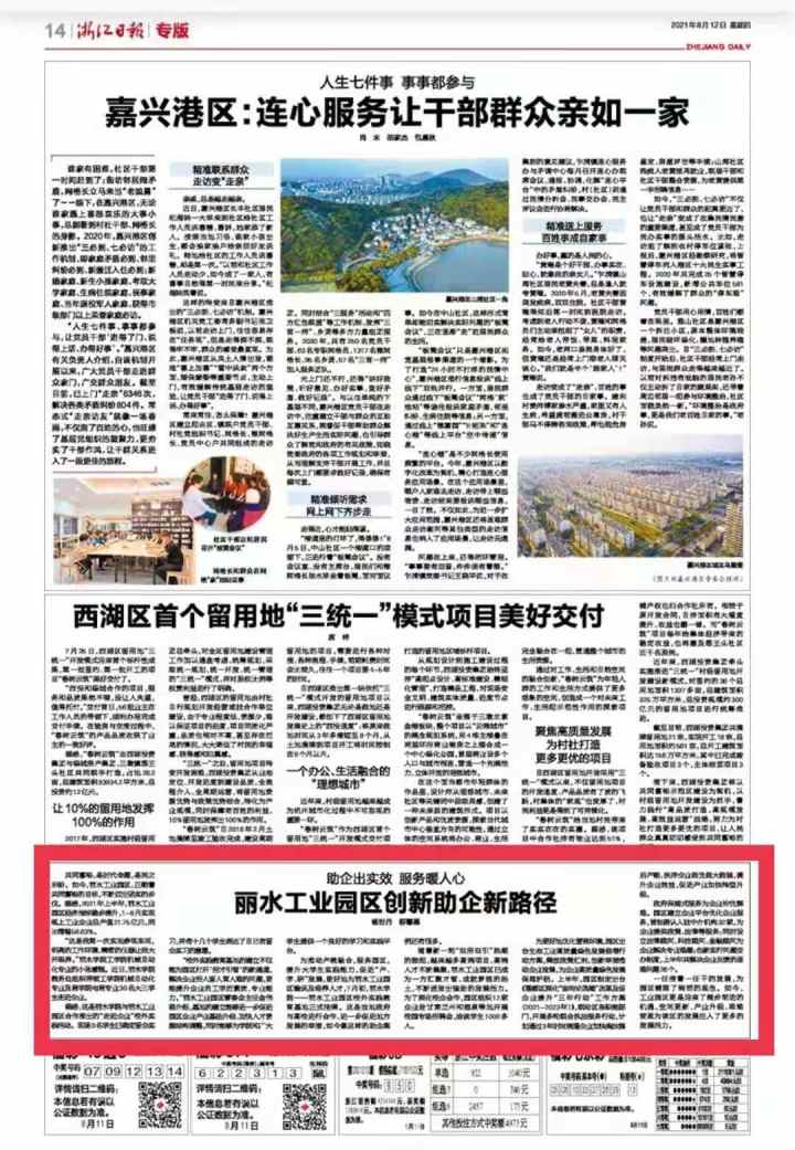 8月12月,浙江日报14版刊发《助企出实效服务暖人心丽水工业园区创新助企新路径》一文。