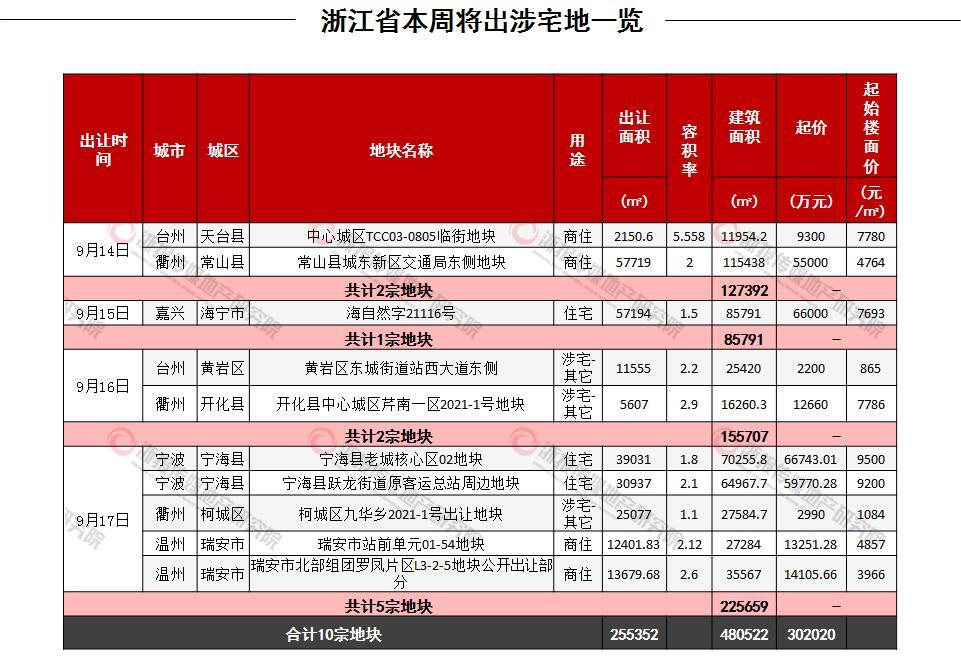 据浙报传媒地产研究院追踪统计,本周 (9.13-9.19)浙江省拟出让涉宅地10宗,体量48万㎡,总起价30亿元。