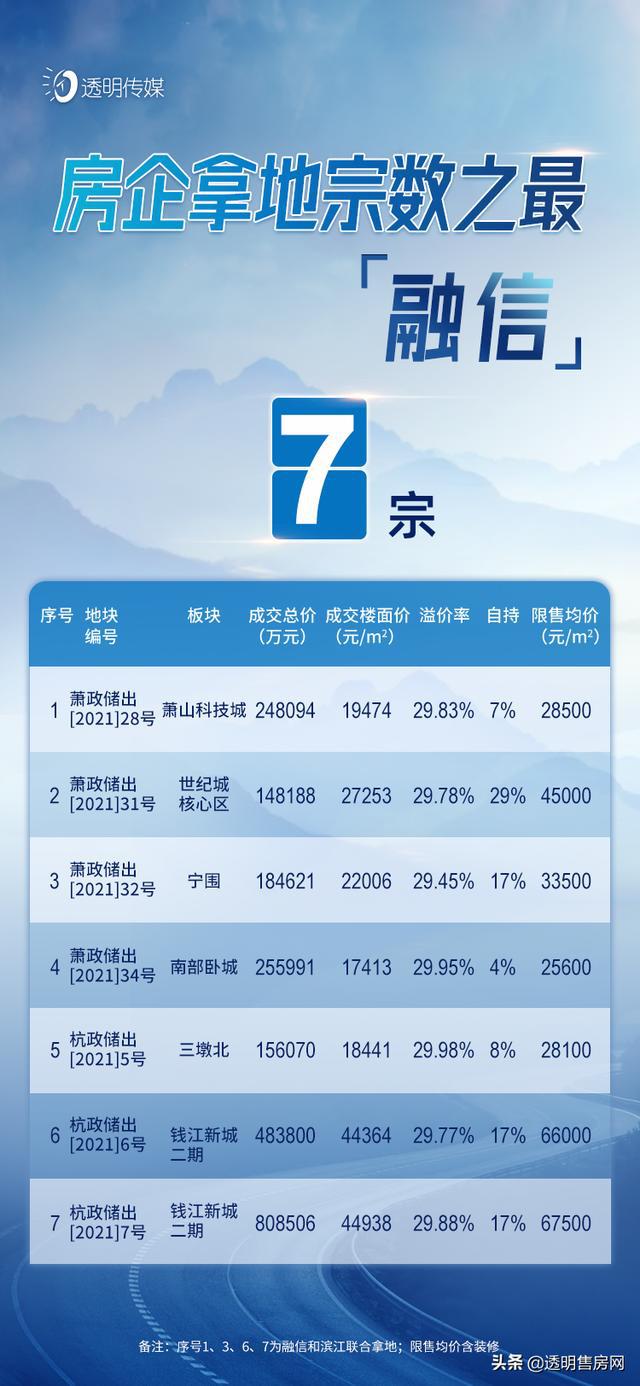 杭州排在第一位的融信以独家及以联合体形式拿地合计7宗,拿地金额142.3亿元(占57宗地块的12%),在融信5.20的品牌日活动中,公布了多宗地块的案名,如澜(三墩北)、傲世纪(世纪城)、雅望(蜀山)。多宗地块预计将于今年入市。