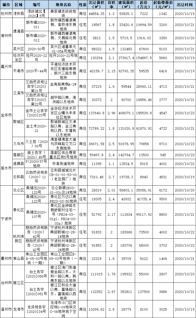 原标题:浙江省11市土地下周(10.19-10.23)出让预告:63宗地块出让,总起价169.8亿元