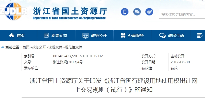 浙江省国有建设用地使用权出让网上交易规则(试行)浙土资规〔2017〕4号