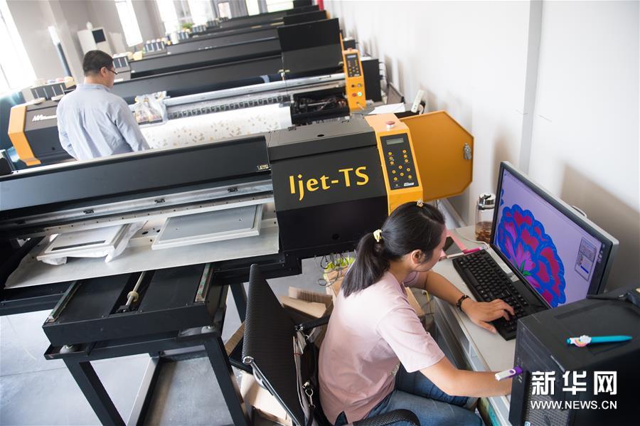 8月25日,园区内一家印染企业的员工用电脑做设计分色,分配到数码机,进行面料图案打印。这种新型的印染方式,可以大大提高花型精细度和印染效率,减少污染。为推动传统优势产业转型升级、加速印染企业集聚发展,浙江绍兴印染龙头企业绍钦织造印染有限公司于2016年9月对厂区进行重新规划,打造以传统文化和现代艺术设计相结合的“尚1051”文化创意产业园区。园区总占地面积12万平方米,改扩建后总建筑面积约7万平方米,目前已有不少商家进驻,整个园区预计于2018年投产使用。新华社记者翁忻旸摄