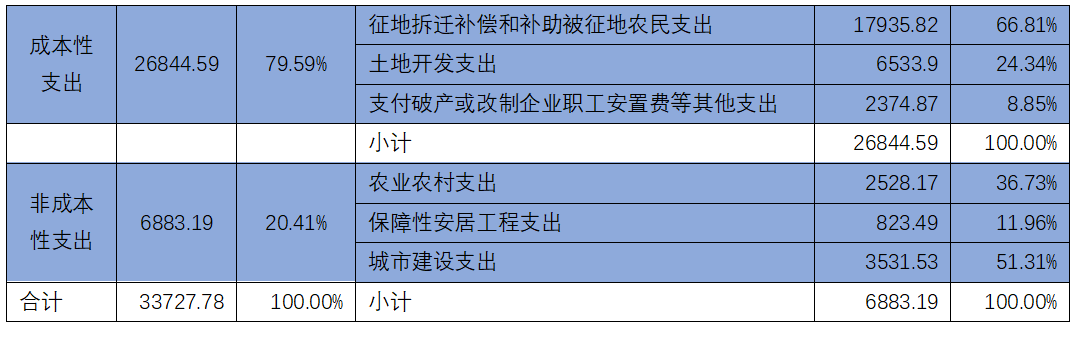 从《2015年收支情况》中,我们可将土地出让支出分为成本性支出和非成本性支出(即土地出让收益安排的支出)两大部分。其中成本性支出用于征地拆迁补偿、补助被征地农民、土地出让前期开发等,非成本性支出包括农业农村和保障性安居工程和城市建设等。《2015年收支情况》的数据简单说,成本性支出26844.59亿元,占支出总额比重79.6%,其中用于征地拆迁补偿和补助被征地农民、土地出让前期开发、支付破产或改制企业职工安置费等其他支出等分别为成本性支出的66.81%、24.34%和8.85%;非成本性支出6883.19亿元,占支出总额20.41%,其中用于城市建设、农业农村、保障性安居工程等分别占非成本性支出的36.73%、11.96%和51.31%。可以总结成下表: