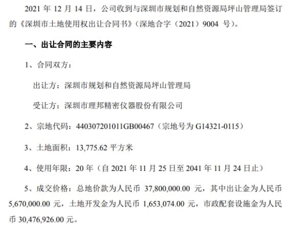 挖贝网12月15日,理邦仪器(300206)发公告称,2021年12月14日,公司收到与深圳市规划和自然资源局坪山管理局签订的《深圳市土地使用权出让合同书》(深地合字(2021)9004号)。