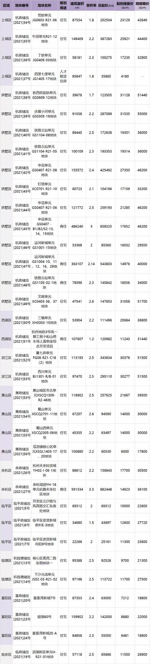 而大体量高总价的或者边缘板块的地块报名情况实际并不乐观,约14宗地块少于3家报名(包含一宗人才租赁地块)。例如起拍价88.24亿元的杭腾未来社区地块、起拍价85.8亿元的华丰造纸厂综合体地块、起拍价64.4亿元的运河新城综合体地块,由于总价较高,或底价成交。